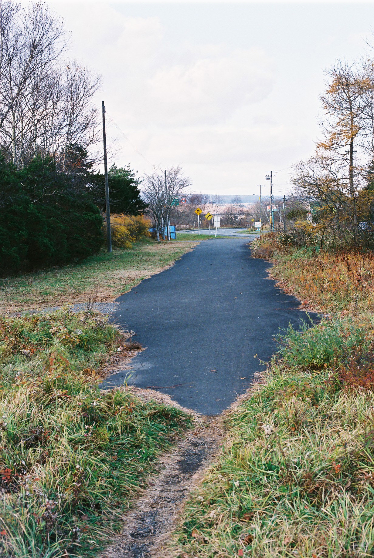 写真G。国道の北を通る市道・錦岡樽前線。途中、妙に幅員の広がっている場所がある。かつて、旧国道が踏切へ直進していた名残りである。
